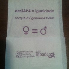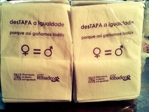 desTAPA a igualdade. porque así gañamos tod@s. Ese é o lema que lucirá nas servilletas do bares participantes no Ribadeo de Tapeo 2012. O Observatorio da Mariña pola Igualdade aproveitará a VII Edición do concurso do Ribadeo de Tapeo, que se celebrará entre o 18 e o 27 de maio, para facer unha campaña a prol da igualdade de xénero na vila. Para elo, repartiránse 140.000 servilletas co lema desTAPA a igualdade. porque así gañamos tod@s entre os 51 bares participantes este ano no concurso coa fin de que, durante os días que dure o tapeo, sexan utilizadas por toda a xente que se anime a degustar as distintas tapas.